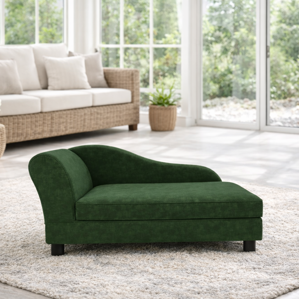 A composed resting piece defined by proportion and restraint. The tailored form sits easily alongside modern furnishings, reading as an intentional interior element rather than a pet accessory. Upholstered in a calm, structured fabric, the seat offers a settled surface for rest, while concealed storage beneath the cushion remains visually absent, preserving the room’s balance. Grounded by a low-profile silhouette, the sofa feels resolved and deliberate—quietly integrating rest and utility without emphasis.