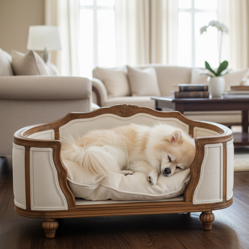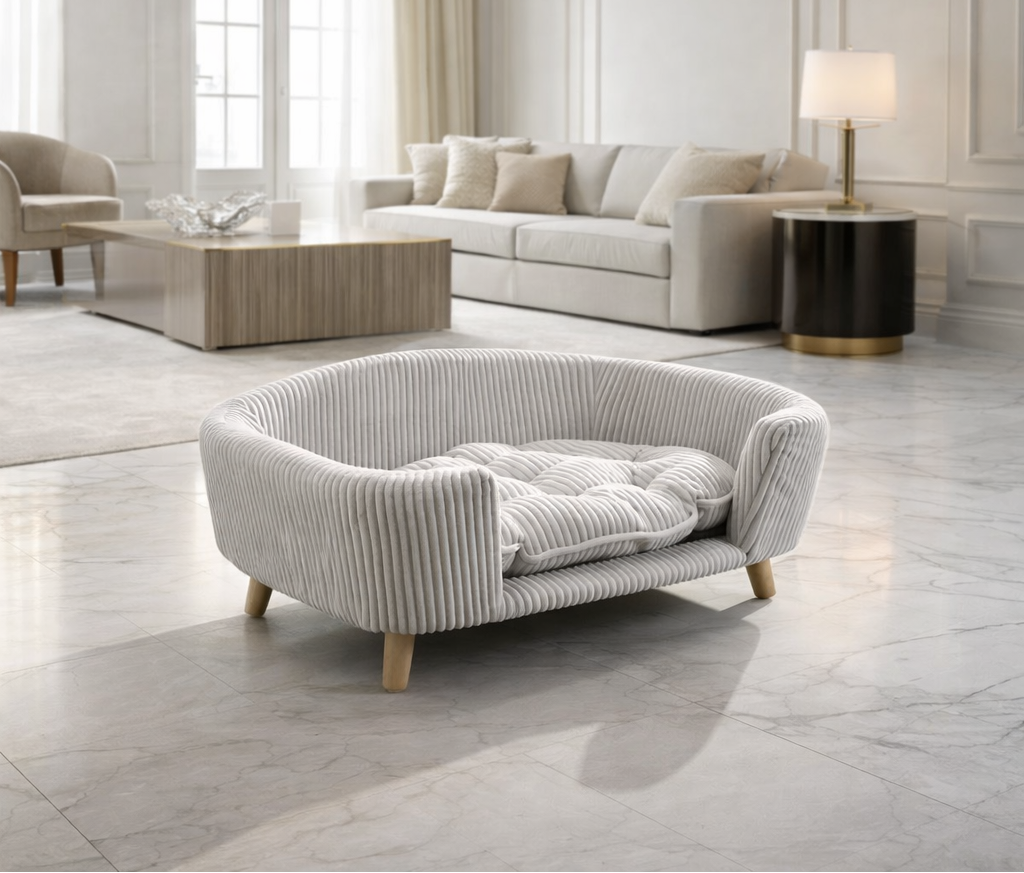 Refined dog furniture made from elevated materials and measured forms—