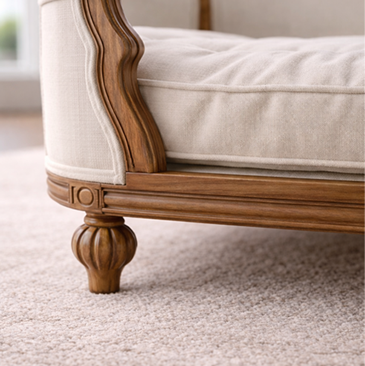 A quiet resting piece defined by material clarity and proportion. The solid oak frame forms a grounded silhouette, softened by subtle curves and restrained edges. Upholstered in natural linen, the surface introduces a calm tactile contrast against the wood’s grain, finished with discreet piping that remains furniture-led rather than decorative. The composition feels settled and composed, offering a dedicated place for rest that integrates seamlessly into refined interiors. Present, deliberate, and resolved.