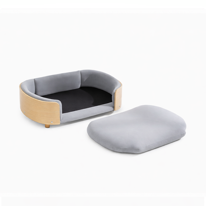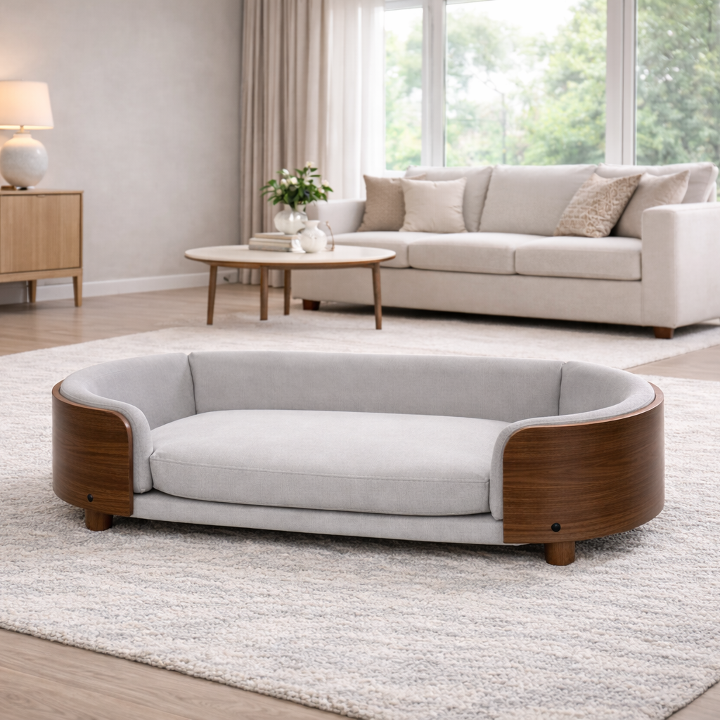 An elevated resting piece defined by minimalist proportion and material balance. The solid oak frame and sculpted walnut-tone backrest form a grounded, furniture-grade silhouette that sits with ease in refined interiors. A velvet-upholstered cushion creates a settled plane for rest, composed and tactile without emphasis. Lifted gently from the floor, the form maintains visual lightness while remaining stable and assured. Calm in presence and resolved in form, this piece reads as a permanent interior element rather than a pet accessory.