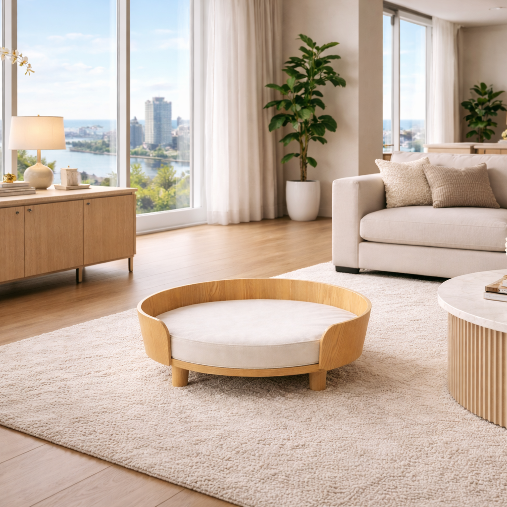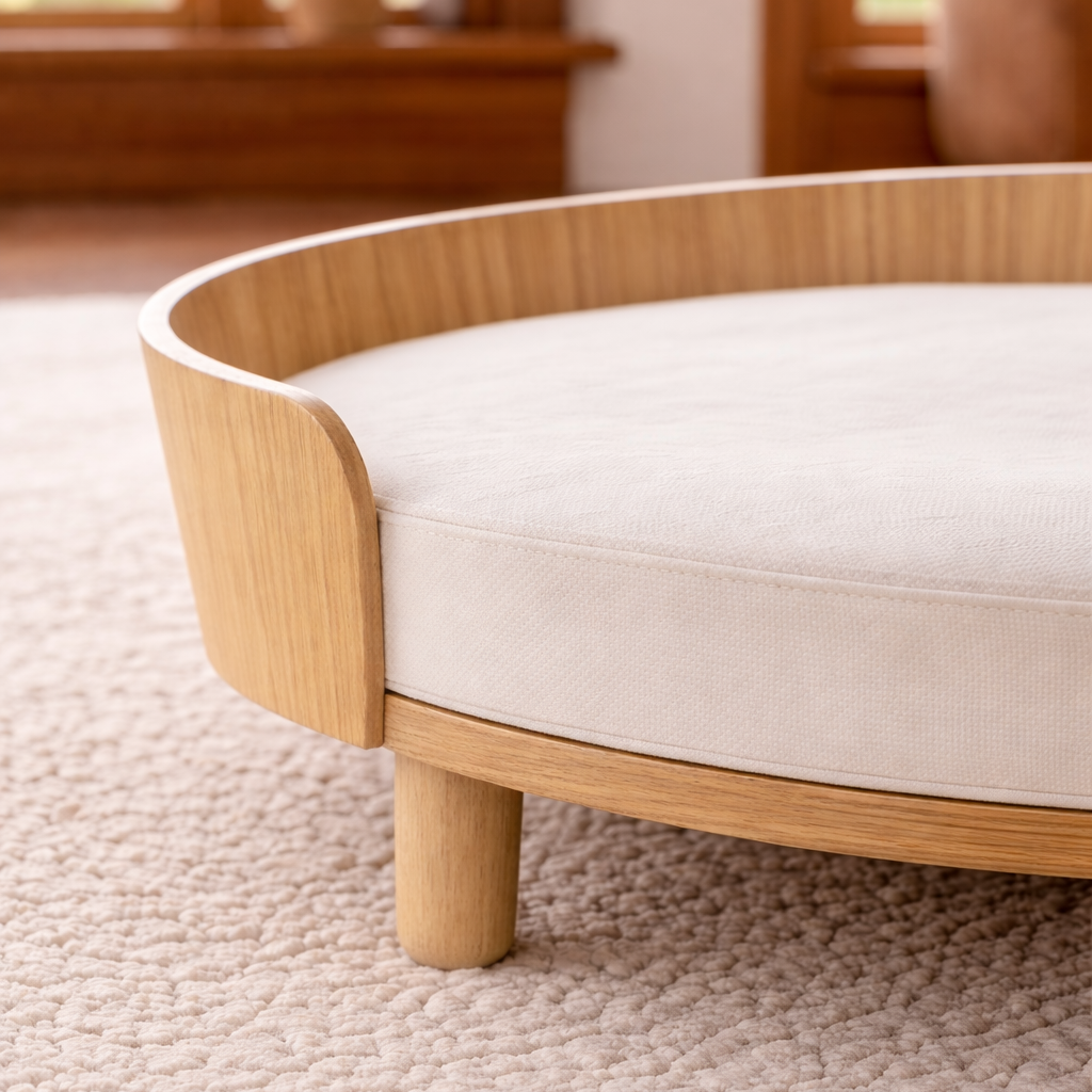 Refined dog furniture made from elevated materials and measured forms—