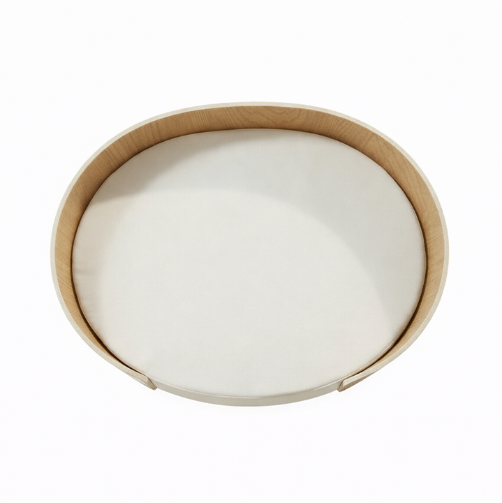 A quiet resting piece defined by soft curves and measured proportion. The wooden frame forms a gentle enclosure while maintaining a light, furniture-grade presence within the room. A woven cushion rests cleanly within the structure, offering a muted tactile contrast to the wood. The interior settles into a calm plane for rest, held by a grounded base that keeps the form composed and resolved. Discreet, balanced, and intentional.