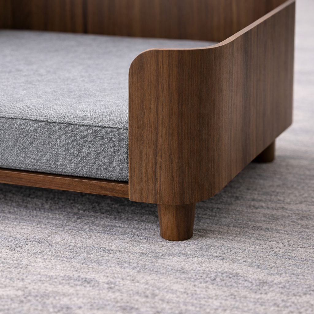 Refined dog furniture made from elevated materials and measured forms—